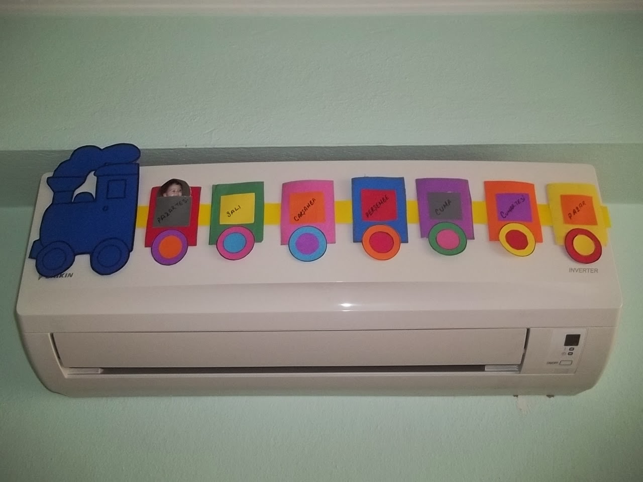 Aslında günlere göre resmi kendim ilerletmem için annem kapıya asma fikrindeydi ki sonradan gelen ufaklıklara karşı yırtmalarını istemediğimiz için klimaya asılmasını istedim :))