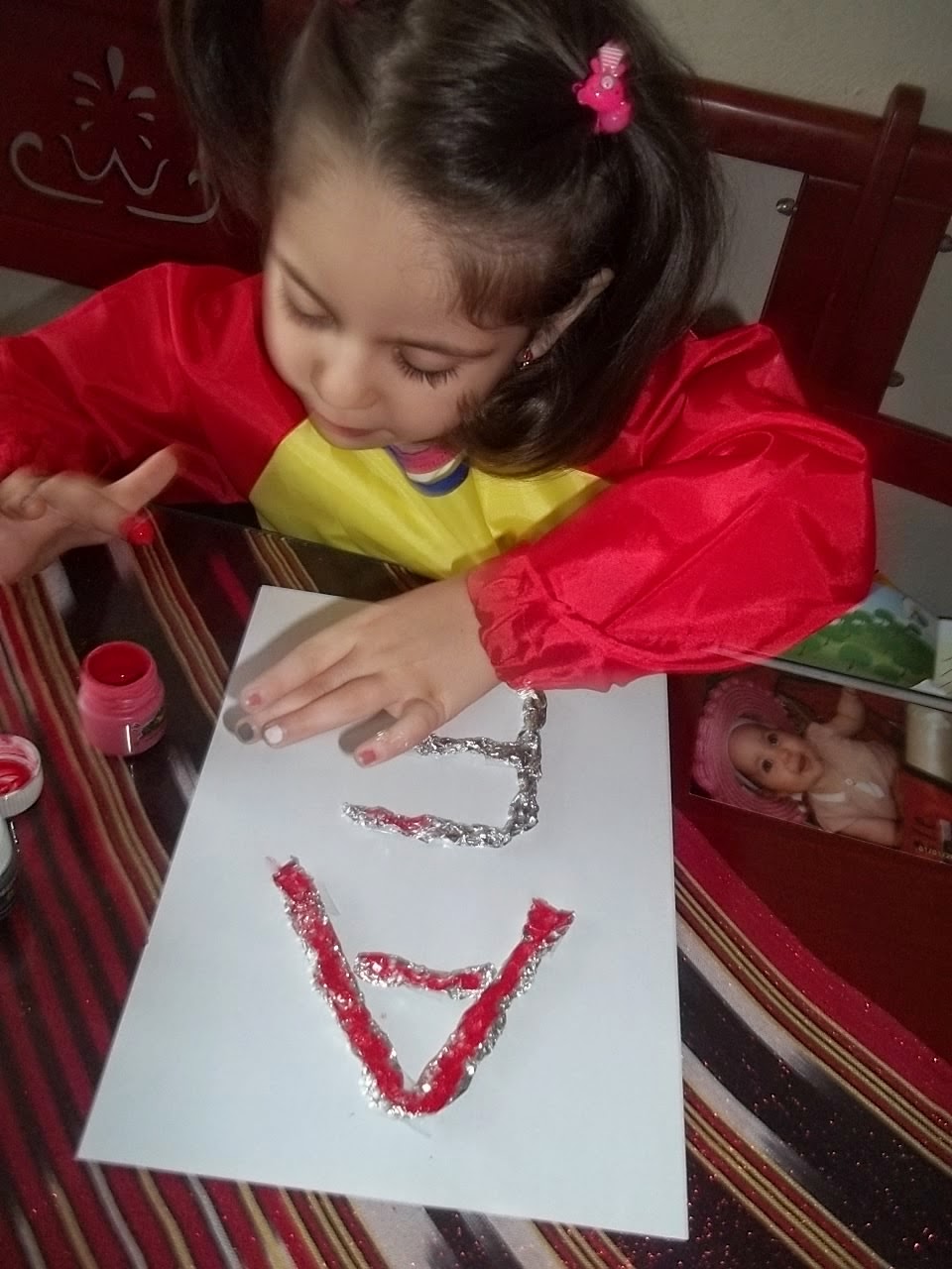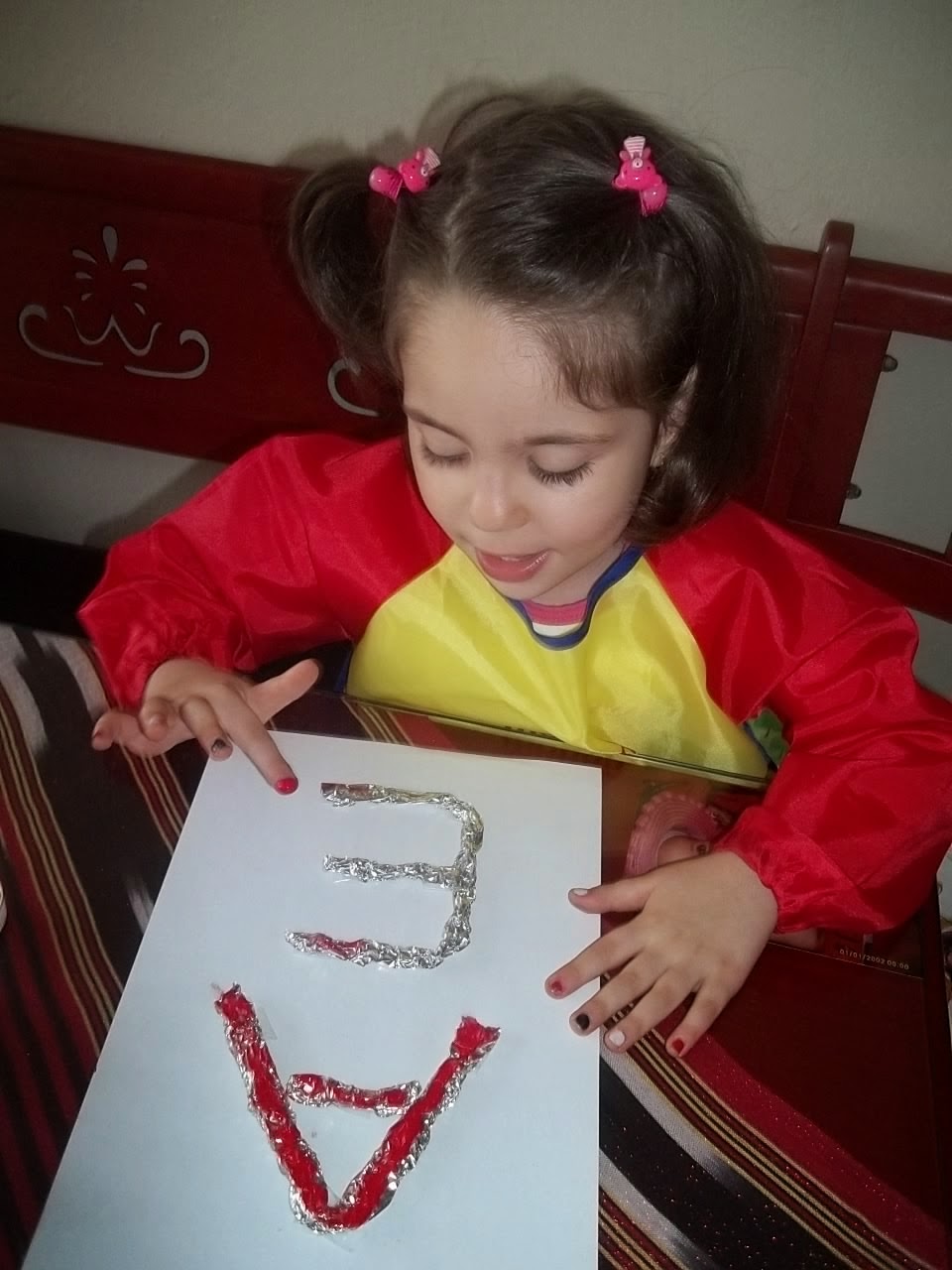 Folyodan A ile E harfi yaparak parmak boyası ile boyadım .. Bana kalsa Azra Ecrin yazıp boyamak istiyordum..Annem şimdilik isimim baş harflerimin yeterli olacağını başka zaman devam edeceğimiz söyleyince kabul ettim..