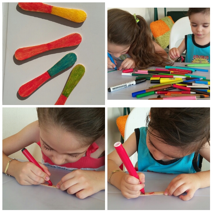 Dondurma çubukarını keçeli kalemle boyayalım dedi annem oturduk masaya aldım bir çubuk biraz boyayıp bıraktım.