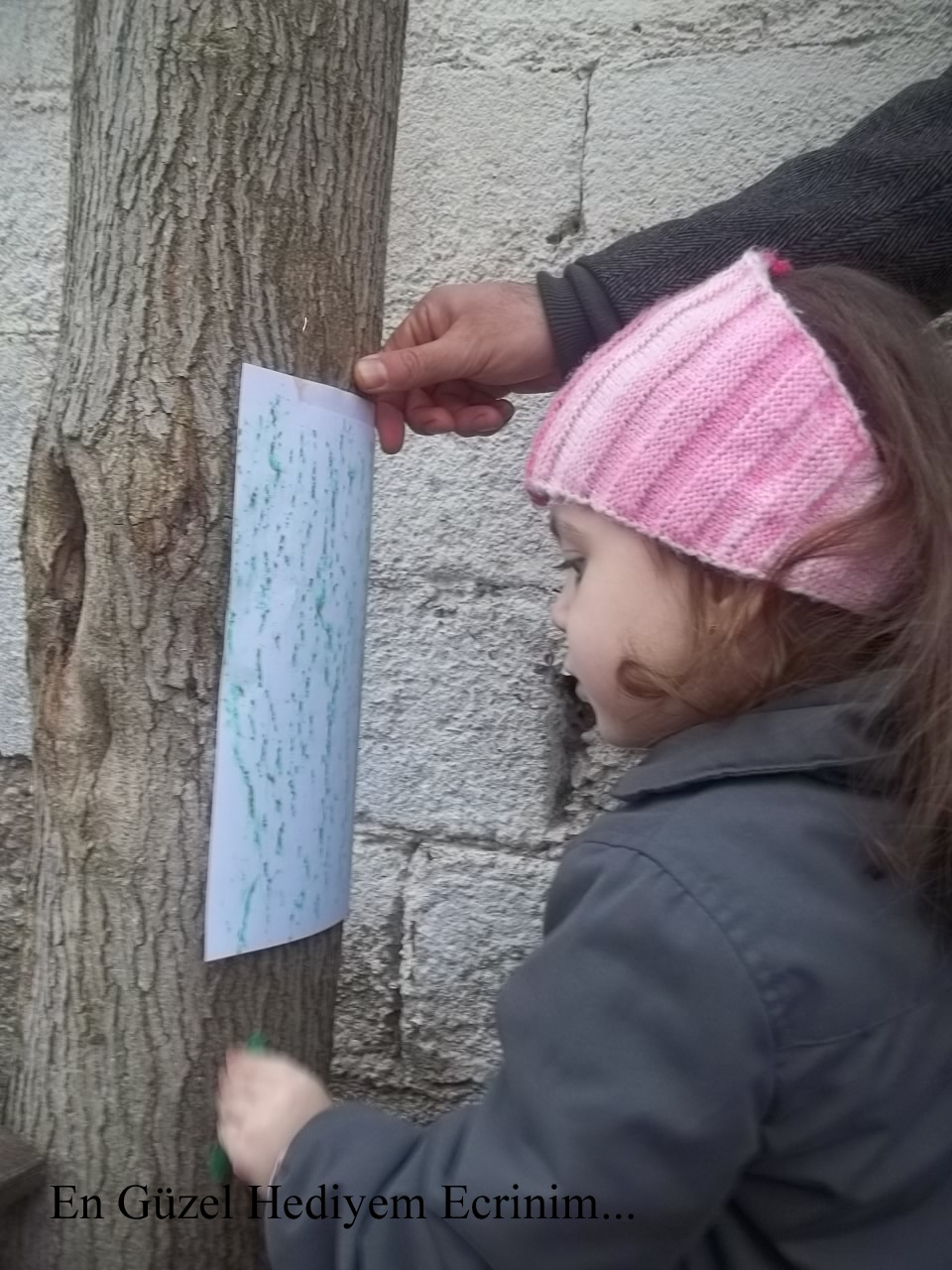 Dedem'lerin oraya gidip daha önce meraklı minik dergisinde gördüğümüz .Ağaç kabuklarının izini çıkardık.