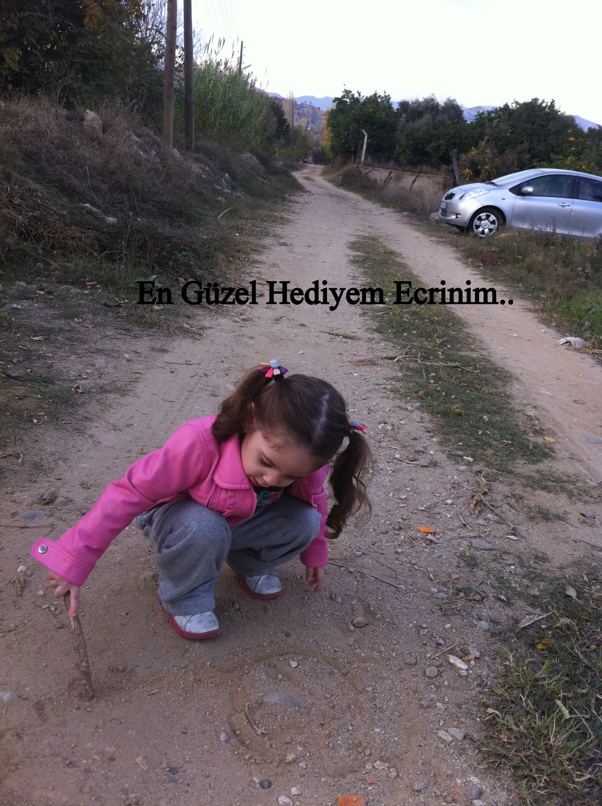Gezintiden sonra ecrin kumları görünce oynamaya başladı.Önce bir sopa bulup sopayla çizgiler yaptı karıncaların yoluymuş :) sonra kumları bir yere topladı tohum dikmiş tohum olarak ta küçük taşlar bulup içine gömdü.En son elindeki sopayı da dikerek tamamladı oda fidanmış :) Tabi sulamayı da unutmadı..