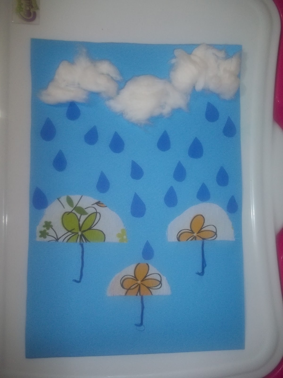 Bulutları annem kalemle çizdi ben pamukları yapıştırdım.Yağmur damlalarını annem kesti biz babamla birlikte yapıştırdık..