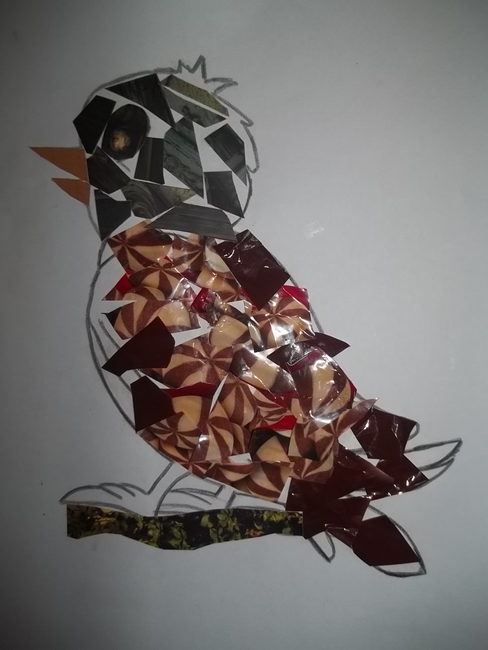 Annem kuşu çizdikten sonra birlikte kesme fikrini sundu bende kabul ettim.Bir kısmını birlikte kestik sonra kesme işini anneme bırakarak yapıştırmaya başladım.İlk başlarda gayet iyi giden yapıştırma işlemi elim yapıştırıcı olunca kağıtlar elime yapışıp beni kızdırdılar. :)
